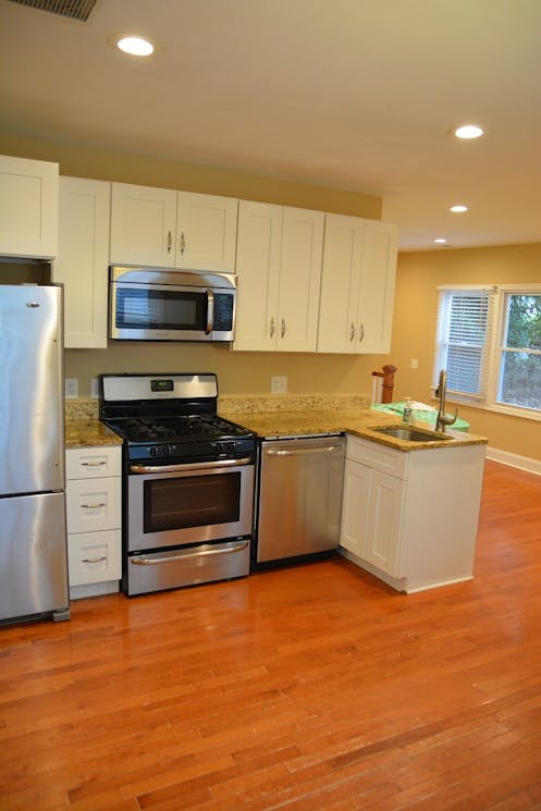 The oversize kitchen has granite counters and open design. Wood floors complement this area to accommodate a big family